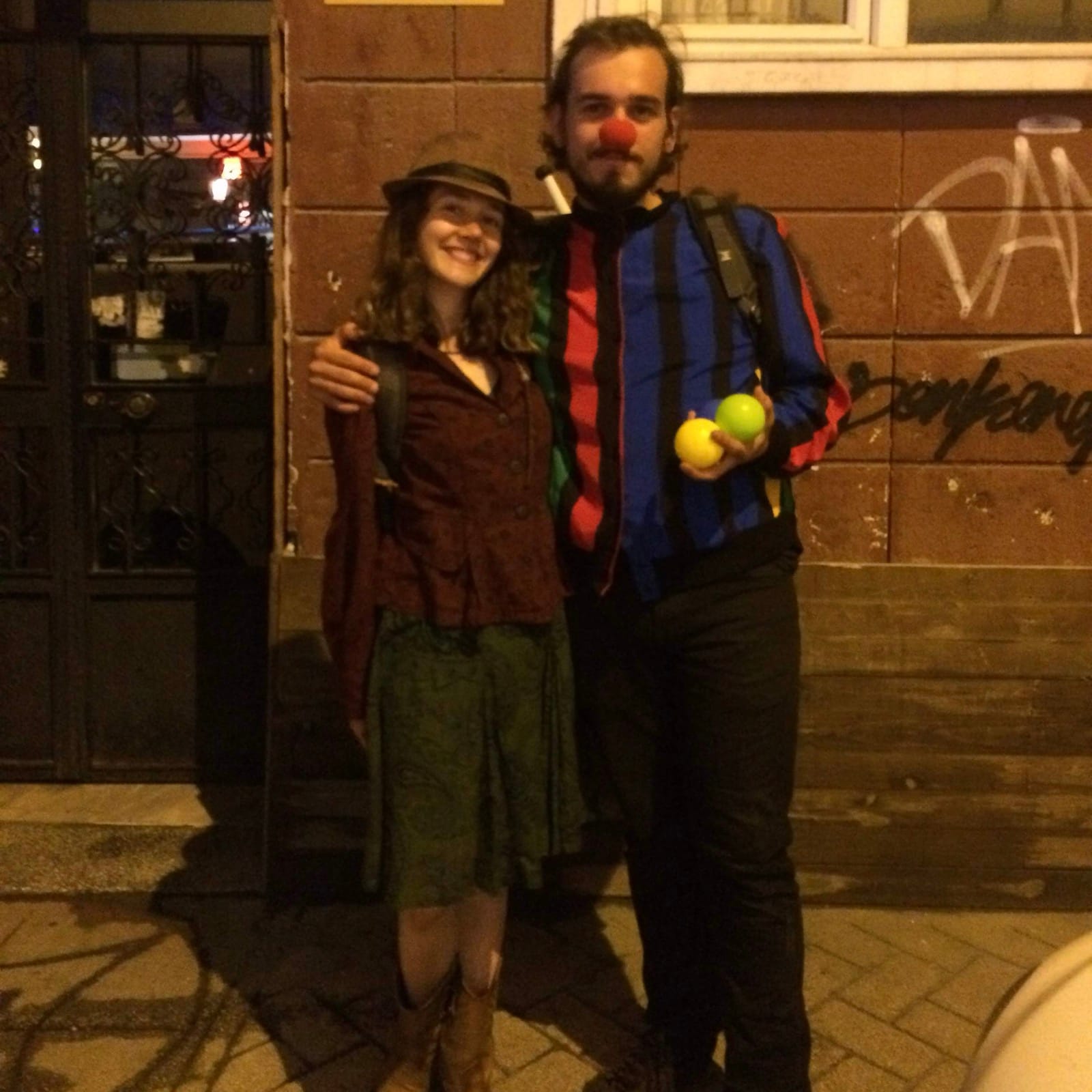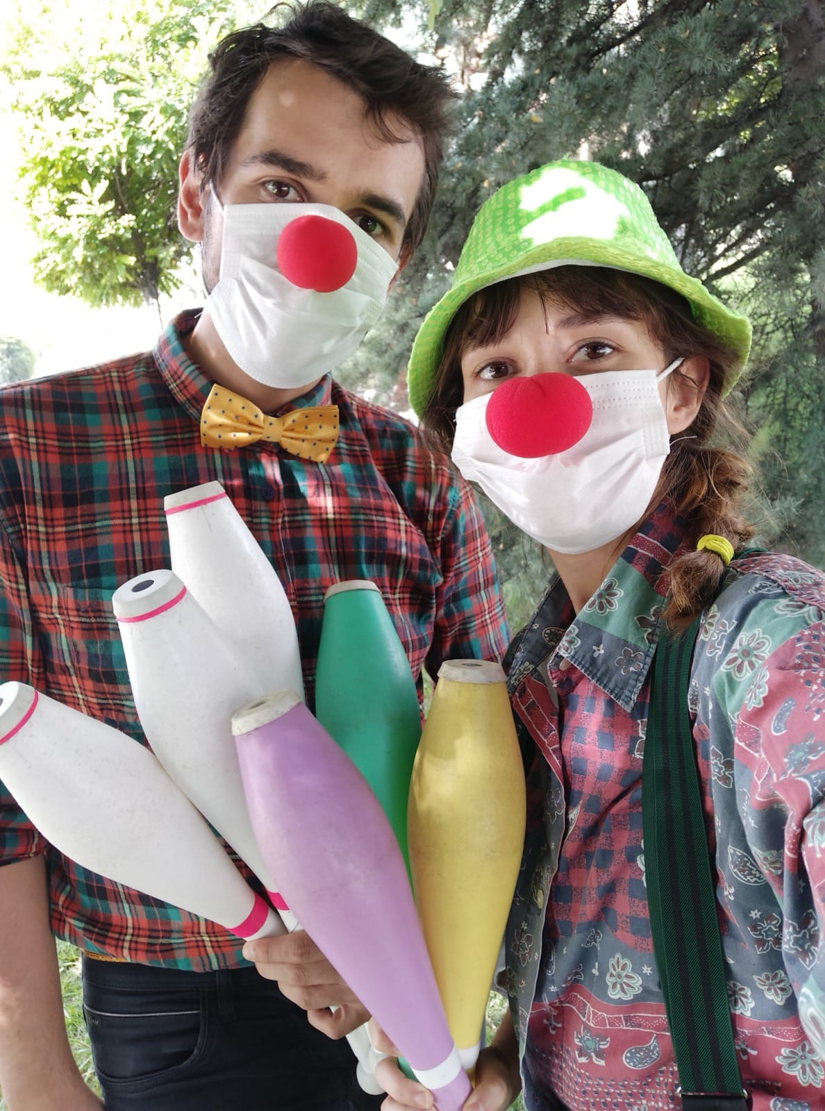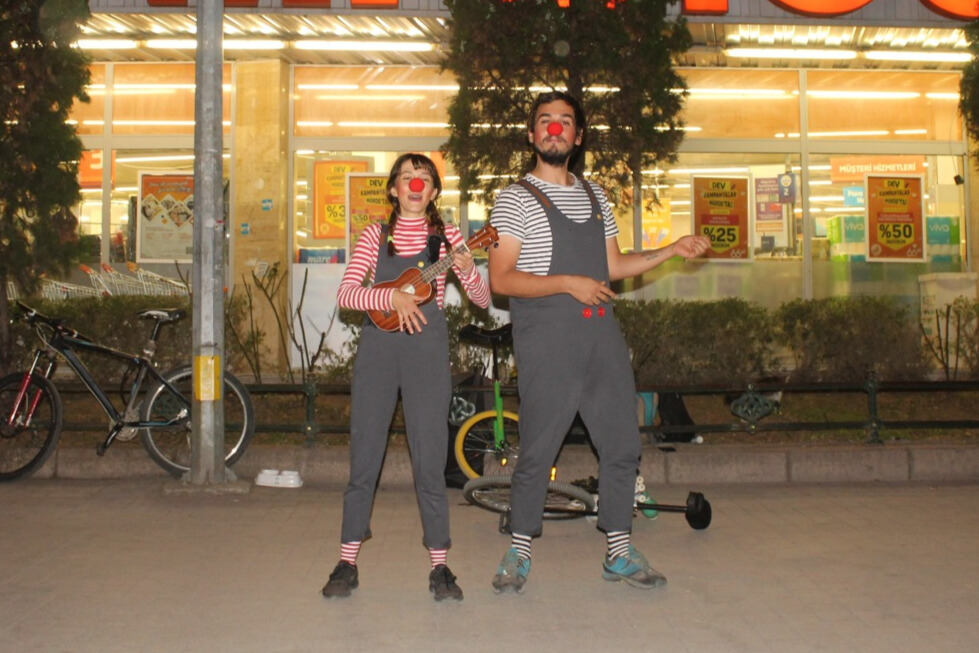 We used the nearby schoolyard, which was still close because of the pandemic. We practiced our skills, prepared a couple of solo acts, and also worked on duo juggling acts. To add some spice, I included my ukulele and harmonica, and Berkay brought his unicycle skills. Eventually we put everything we had! We were also discussing the costume a lot. We wanted to be seen as a duo, so came up with the easiest option, striped T-shirts and overalls and, red noses! After a few weeks, we were ready to try it out on the street!